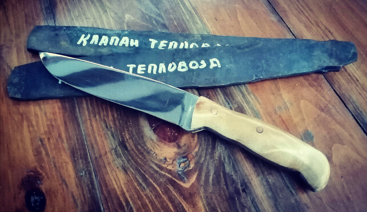 Здравствуйте уважаемые подписчики канала нож и ножны и все те, кто зашёл ко мне из любопытства. Сегодня покажу очередное моё изделие. Один мой товарищ попросил сделать цельнометаллический нож – фултанг. Да не просто фултанг, а из тепловозного клапана. Он даже под суетился, сам нашел клапан, отдал на перековку и прислал мне уже готовую поковку. Долго я не решался начать, все-таки фултанг, я такого еще не делал. Но как только появилось чуть больше свободного времени, приступил к ваянию своего первого цельнометаллического клинка. Как говориться "руки делают - глаза боятся" Первым делом на поковке нарисовал маркером будущий нож. Затем аккуратно вырезал грубый контур болгаркой. Спуски решил делать от обуха. Так как толщина поковки была приличная, то сначала металл спускал на наждаке на крупном зерне. Далее перешёл работать на гриндер. Когда спуски были сформированы и надо было подумать о закалке клинка, то тут я обнаружил, что клинок не реагирует на магнит. Позвонил заказчику и обрисова