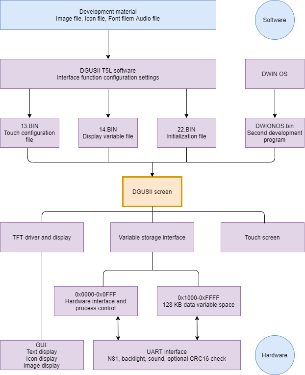 Далее рассмотрим программу DGUS (сокращение от DWIN Graphic Utilized Software) и основные формируемые файлы для работы. Ниже представлена краткая диаграмма разработки ПО.
