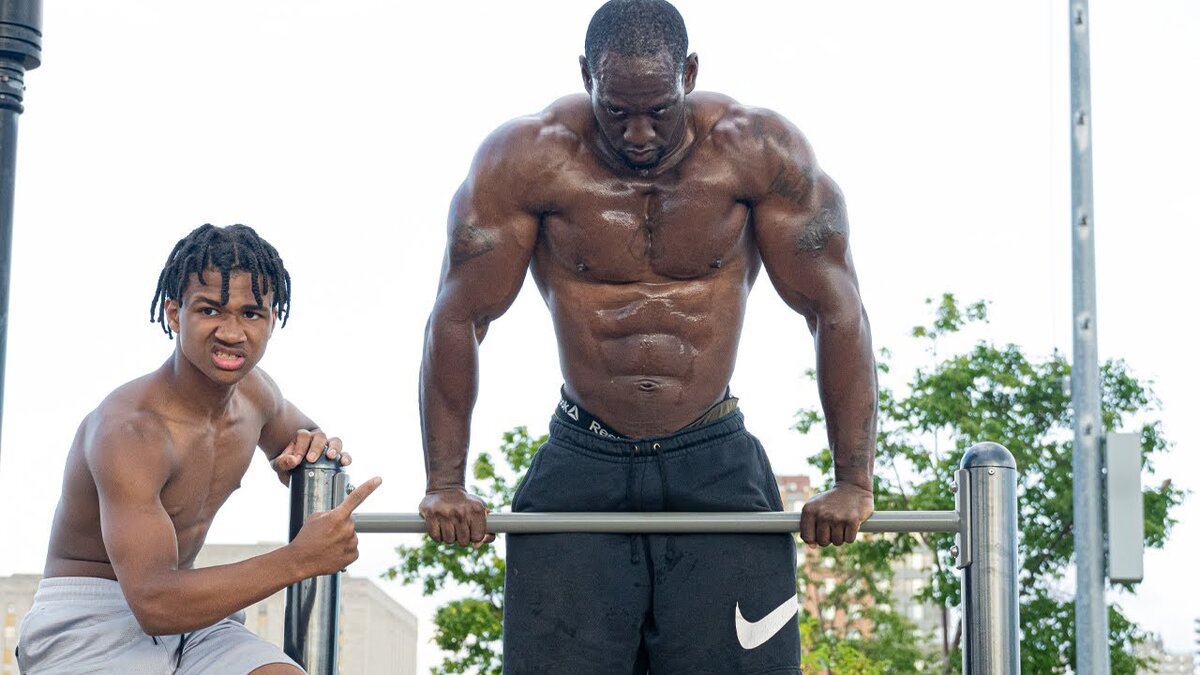 Ни для кого не секрет, что чем вы тяжелее, тем сложнее становится работать с весом собственного тела, и чем больше масса, тем легче работать с дополнительным весом. Сегодня поговорим об атлетах, которые с этим правилом не согласны и решили доказать нам обратное, а так же выясним зачем габаритным атлетам нужен воркаут и работа на функциональность, обсудим недавний новый челлендж Дениса Семенихина, и о многом другом. Короче говоря будет мощно, будет тяжело, все как вы любите... Итак, первый здоровяк, это спортсмен по имени Akeem Supreme, его вес 108кг достаточно сухой мышечной массы и сегодня он выполняет сэт в котором нужно будет отжаться от пола 50 повторений, затем сделать 25 подтягиваний и все это считается одним кругом. Теперь каждый круг спортсмен должен убирать по 5 повторений с подтягиваний и 10 с брусьев пока не дойдет лесенкой до конца. После этого Ада, ему нужно будет сделать заключительные 25 отжиманий на брусьях и 15 берпи в связке с выходами силой. И все это друзья нужно о