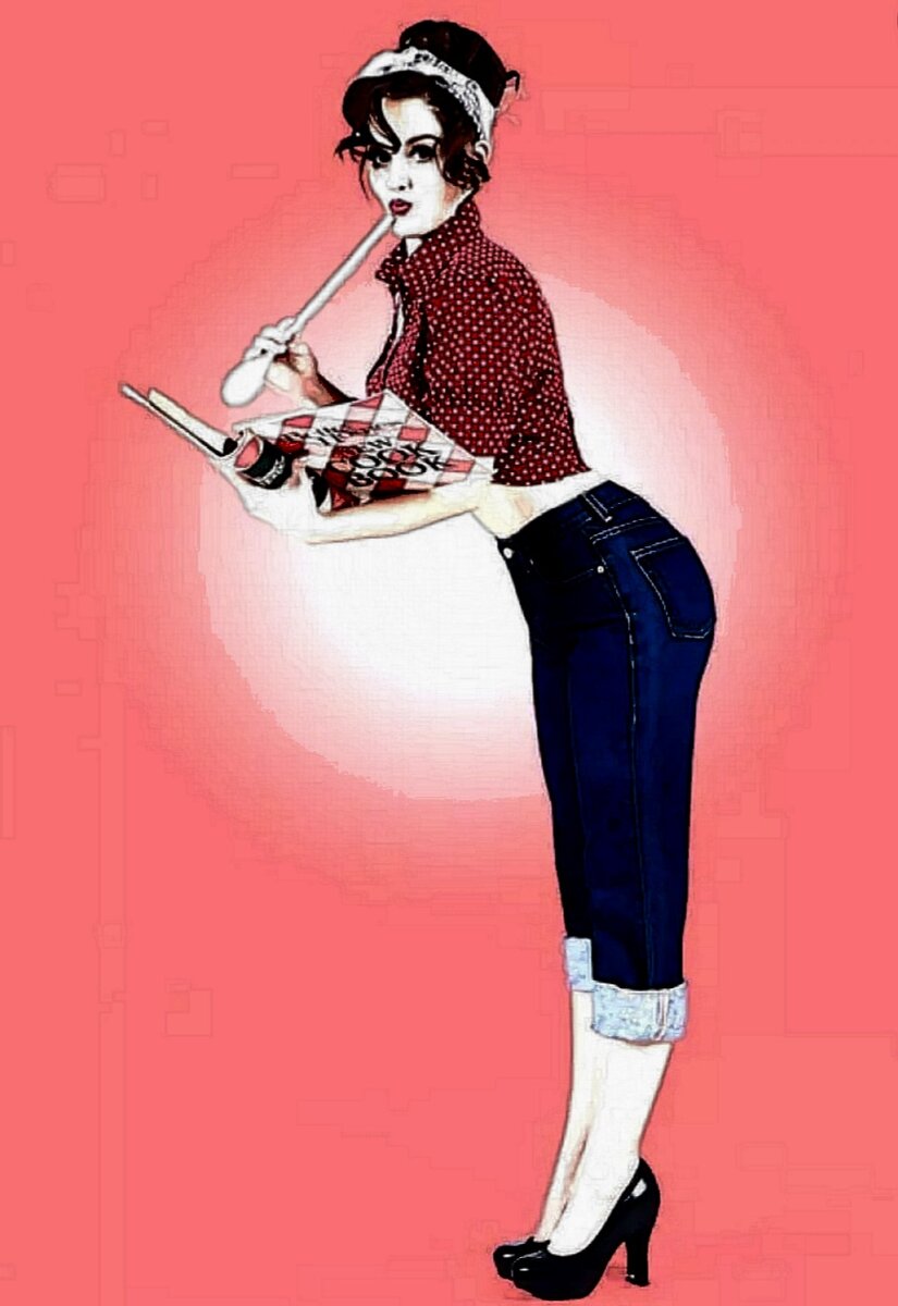 Самые распространенные образы: - Короткие джинсовые шорты с высокой талией, клетчатая рубашка, завязанная на узел и каблуки на шпильке. Такой базовый наряд мог варьироваться: рубашка сменялась коротким топом на узких бретелях или корсетом. Шорты могли заменять джинсовые укороченные брюки. - Сарафаны и платья в романтическом стиле. Ведь именно они делают женщину женщиной, придают ей соблазнительности, легкости, романтичности. - Свободная полупрозрачная блузка а-ля «крестьянка», завязанная на узел и пышная юбка. - Плавки с высокой талией, сдельные купальники, всевозможные купальные костюмы с рюшами. Акцент в одежде делали на яркость и различный принт: горох, клетка, цветочные мотивы #мода и красота #пин-ап #стиль #женщины #женские истории #женская психология