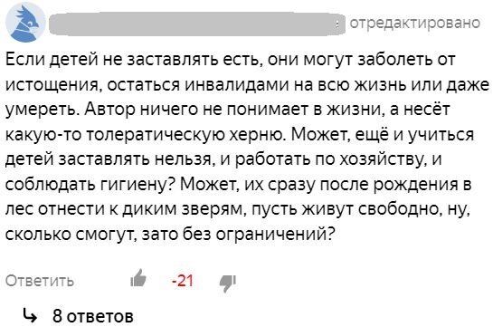 Смотрите, какая жесткая связь в психике - если не заставлять есть, то ребенок останется инвалидом или даже умрет. Коммент написан из сильных эмоций, потому что страх за ребенка - это очень сильная эмоция.