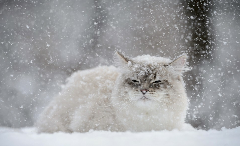 Пушистый кот во время снегопада.