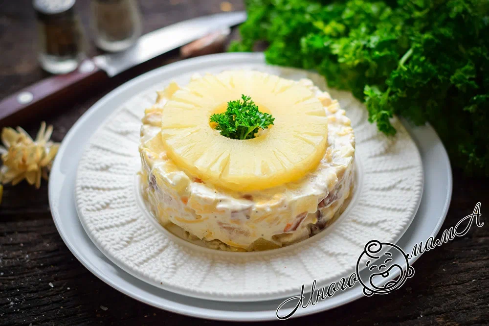 «Мама, а почему этот салат так забавно называется? — спросила меня дочка, помогая мне на кухне готовиться к приходу гостей, — Потому что он нравится женщинам?» С таким выводом трудно не согласиться. А я люблю этот легкий салат еще и за быстроту приготовления. Но мне кажется, чтобы данное блюдо придется по вкусу любому человеку. Список необходимых продуктов: Этот салат не только вкусный, но и очень простой в приготовлении, ведь почти все ингредиенты можно купить в магазине уже в готовом виде. Нужно только заранее отварить куриную грудку с добавлением лаврового листа, соли и нескольких горошин черного перца. Сваренному мясу я даю остыть в бульоне, чтобы оно сохранило мягкость и сочность. Из консервированных ананасов сливаю жидкость, кладу их на разделочную доску, нарезаю аккуратными кубиками среднего размера и складываю в удобную просторную миску. Куриное филе достаю из бульона, обсушиваю, нарезаю небольшими ломтиками и отправляю к ананасам. Копченую куриную грудку можно приобрести в люб