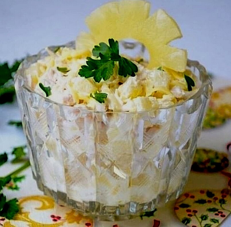 Если вы ищете вкусный и простой в приготовлении салат, то вы его нашли. Приготовление займёт очень мало времени, а вкус вас приятно удивит. Этот салат украсит любой праздничный стол. Ингридиенты : Приготовление : 1. Грибы нарезать (не очень мелко), лук наркзать мелкой рубкой и обжарить на разогретой сковороде до золотистого цвета. 2. Отварить филе в подсоленной воде и нарезать кубиками. 3. Сыр натереть на крупной тёрке. 4. Сложить все ингредиенты в салатник. Добавить кукурузу и нарезанный кубиками ананас. Тщательно все перемешать. 5. Заправить майонезом и натертым чесноком. Тщательно перемешать. При желании, салат можно украсить. Салат готов! Приятного аппетита!!!