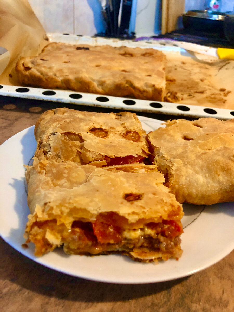 Мясной пирог со слоёным (даже бездрожжевым тестом) - это вкуснятина. Берём готовое листовое тесто. Размораживаем, раскатываем. Наполняем всеми возможными остатками из холодильника. Удивляем своими кулинарными навыками непосвящённых 😀Заодно и порядок в холодильнике наводим. А если серьёзно, такой вариант отлично подходит для того, кто хочет получить прочные навыки работы с тестом. Я использовала готовые замороженные листы. Просто потому, что они у меня были. День не предвещал никаких неожиданностей. Появилось время на хозяйственные работы после выходных. Ну вы же знаете как это бывает. Вся семья дома, заходят в гости родные. Ты готовишь, они едят. В понедельник по полкам холодильника начинают передвигаться остатки того, что не пошло в переработку накануне. На полках в дверце обнаружились почти выдавленные пачки с соусами. Немного теста. Фарш, которого уже не хватит на котлеты. Нашлась завалявшаяся половинка луковицы и рассыпавшиеся зубчики чеснока. И даже один тоскливый помидор. И сы