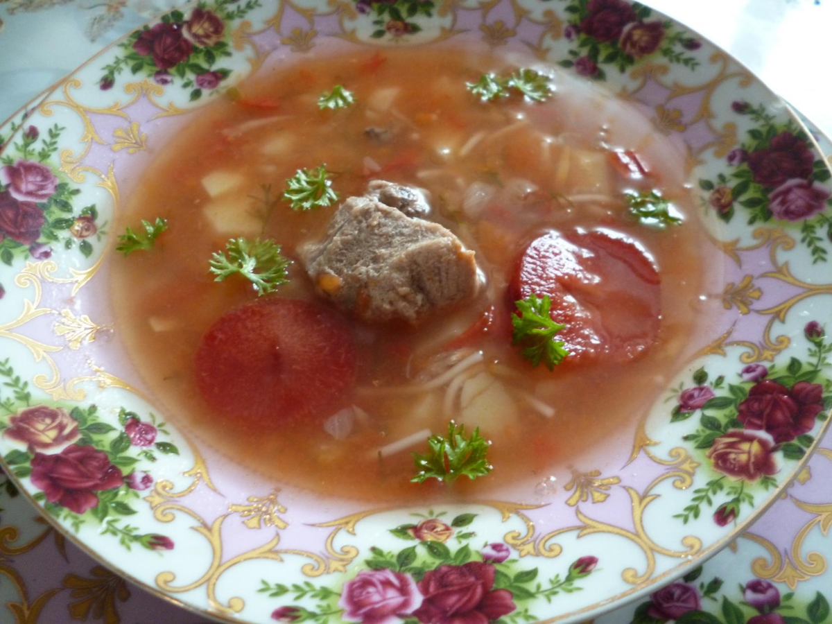 Ингредиенты на 6 порций:мясо свинины( постное)-400 г; картофель-2 шт;морковь-1 шт; вермишель-50г; сок томатный-1,5 л; у меня измельченные замороженные помидоры-0,5 л;сливы замороженные