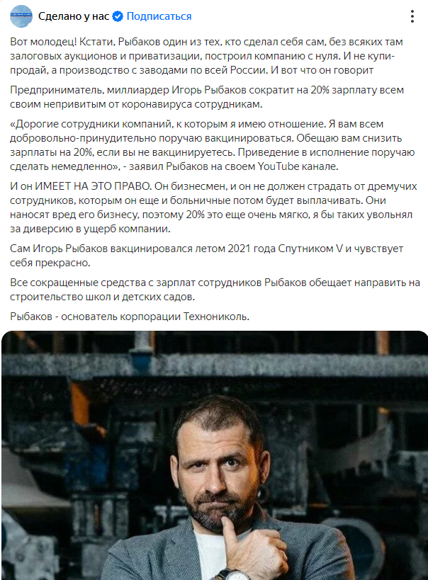 Здравствуйте товарищи. Давненько на моем канале не появлялись статьи связанные с сайтом "Сделано у нас,", как то было не до них да и других проблем хватало. Но вот недавно попалась мне одна статейка где автор сайта на Яндекс-дзене, всячески оправдывал принудительную вакцинацию проводимую в России, при этом поет дифирамбы олигарху Игорю Рыбакову, который сделал себя сам в 90 годы. Сначала выскажусь насчёт принудительной вакцинации. Я например не антипрививочник. Но - я строго за добровольную вакцинацию. Если вакцинацию проводят принудительно, то это лишь усилит антипрививочные настроения и даст громадную почву для различных конспирологий, а так же для расшатывания и без того напряжённой ситуации в стране. Кстати насчет конспирологии. Вот один из таких вот примеров которые можно найти в интернете.