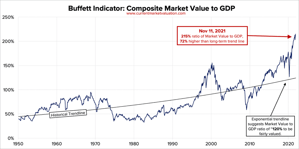 В последнее время в новостях все чаще сталкиваюсь с предупреждениями аналитиков, что вот-вот наступит коррекция. В подтверждение своих опасений специалисты ссылаются на находящийся на рекордных значениях индикатор Баффета. Предлагаю разобраться, что из себя представляет индикатор, и стоит ли инвесторам действительно опасаться его текущих значений. 📍Индикатор представляет собой отношение совокупной рыночной капитализации всех публичных американских акций к квартальному показателю валового внутреннего продукта, и используется для того, что выяснить насколько переоценен или недооценен фондовый рынок по отношению к размеру экономике страны. 📍Индикатор не раз предсказывал опасные ситуации на рынке: так, он вырос до рекордного уровня во время "пузыря доткомов" (1995-2000) и в преддверии мирового финансового кризиса (2008-2009). 📍На данный момент уровень индикатора равен 215%, это на 72% выше исторического среднего значения, что, если верить показателю, прямо указывает на сильную пе