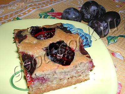 Поверх печенья вылить тесто и разровнять. На тесто уложить половинки слив разрезом вниз. Поставить в разогретую до t=180~200°C духовку до зарумянивания теста (на 15~20 минут).