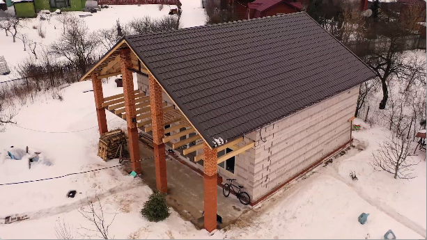Обзор #3 Дом от компании Техно-Ремонт, в Московской области, Подольский район, Бережки. Построен дом на монолитной ж\б плите на свайном ростверке – самый надежный и конструктивный фундамент на территории МО. На ж\б плиту мы укладываем цоколь из красного обожженного кирпича марки м-150, высотой 3 ряда. Стены выполнены из газосиликатного блока, толщиной 375 мм, плотностью д500. При возведении несущих стен, укладывается базальтовая сетка с облицовкой. Есть 2 открытые веранды, удерживаемые 4 колоннами из кирпича. Колонны растянуты с 1 го на 2 ой, на них крепится межэтажное перекрытие. Плиты перекрытия между этажами укладываются на красный кирпич, нельзя на блок, это важно. Также устроены монолитные ж\б перемычки. Они находятся над дверными и оконными проемами. Конфигурация помещения- прихожая 10 м2, котельная 6 м2, гостевой санузел 6 м2, гостевая спальня 15м2, холл 10 м2 с лестницей, кухня и гостиная 42 м2 НА 2 этаже 3 спальни, одна из которых принадлежит заказчикам 25м2, индивидуаль
