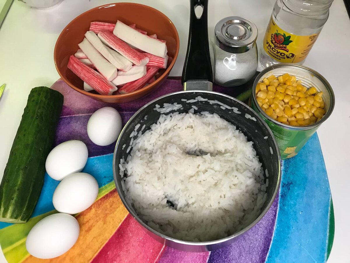 Всем привет! Решили сегодня порадовать вас рецептиком)) Думаю все прекрасно знают это блюдо, но все же давайте я вам напомню как его готовить. На повестке дня: крабовый салат. Нам понадобится: Пропаренный рис 1 стакан Крабовые палочки 400 гр. Куриные яйца 4 шт Огурец Консервированная кукуруза 400 гр Лук 1 шт Уксус Соль, перец Рис и яйца необходимо предварительно отварить. В то время пока варится рис с яйцами необходимо мелкими кубиками нарезать лук, добавить в него 2 столовых ложки уксуса, 1 столовую ложку сахара и залить водой, чтобы вода слегка прикрывала лук. Все тщательно перемешиваем и оставляем лук мариноваться на минут 15-20 (после мариновки необходимо слить лишнюю воду) В тоже время нарезаем маленькими кубиками крабовые палочки и огурец, а также мелко нарезаем вареные яйца и смешиваем все ингредиенты. То есть к рису добавляем лук, крабовые полочки, консервированную кукурузу, огурец, вареные яйца и солим и перчим по вашему вкусу. Вот такой вот получился быстрый и легкий в приго