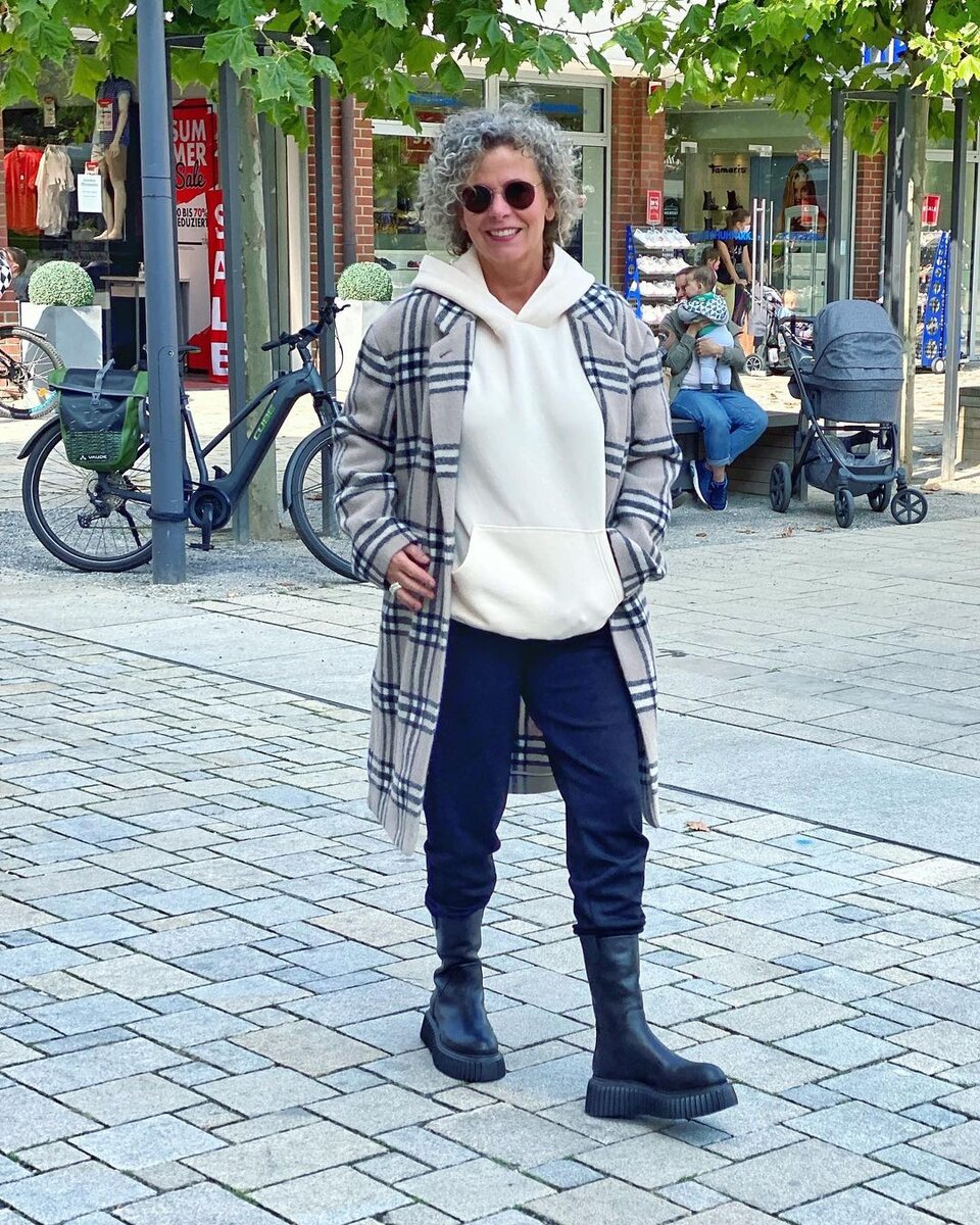 Как выглядеть молодо и свежо в возрасте 50+? Наша сегодняшняя героиня следит за тенденциями, ведет свой модный Инстаграм и подает пример хорошего вкуса многим зрелым женщинам. Давайте рассмотрим наиболее удачные образы от немецкой модницы на осенне-зимний период. Instagram-блогер из Германии обожает расслабленные образы в стиле кэжуал, в которые прекрасно вписываются толстовка, удобные трикотажные брюки и клетчатое пальто. Кожаные ботинки на платформе надежно защитят ноги от холода, дождя или мокрого снега. В гардеробе зрелой модницы также есть элегантные брючные костюмы. Модель в мелкую клетку можно носить с однотонной водолазкой и пальто нейтрального бежевого оттенка. Возраст – не повод отказываться от кожаных вещей. Так, брюки из натуральной или эко-кожи отлично ладят с трикотажем. Сочетание фактур добавит образу стиля, подчеркнут индивидуальность и безупречный вкус своей владелицы. В осенне-зимний период не обойтись без теплого платья из трикотажа, которое прекрасно смотрится в