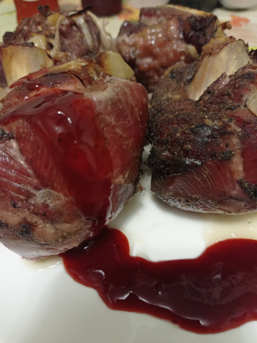 Доброго времени суток, дорогие читатели и гости моего канала! Хочу предложить вам полюбившееся нами и уже вошедшее в число самых простых и вкусных, и постоянных блюд. Это голени индейки. Почему именно голени, скажете вы. Мясо в них напоминает говядину. Если грудка более нежная, диетическая, то голени получаются более насыщенными, плотными. Много не съешь, кусочка вполне достаточно, чтобы ощущать себя сытым. Да и цена вполне приемлема. Поэтому голени и получили постоянную прописку в нашей семье. Две больших голени вполне достаточно. Чтобы лучше пропеклись, их надо разрубить на три части. Далее делаем маринад, как на шашлык. Маринад: соль, перец душистый и чёрный, много-много лука кольцами, сухое белое вино - 0,5 л Мясо натираем солью и перцем, пересыпаем луком и заливаем белым сухим вином. Оставляем на сутки в холодильнике. Оно за сутки хорошо промаринуется, пропитается всеми специями, будет необыкновенно мягким и нежным. Достаем противень, перекладываем мясо вместе с луком и