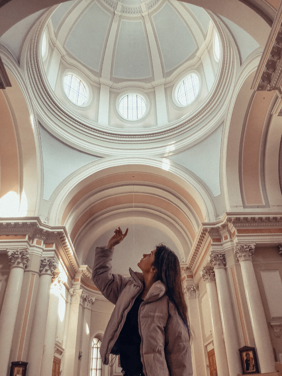 В 1739 г. арх. П. А. Трезини составил проект каменной церкви в глубине участка выходящего с одной стороны на Невский проспект, а с другой на Итальянскую улицу. Но проект не был осуществлен. Новый проект собора выполнил арх. Ж. Б. Валлен-Деламот. Задуманная им композиция напоминала триумфальную арку со скульптурными группами вверху и двумя одноярусными башнями-звонницами и была выдержана в духе барокко. Начатое по этому проекту строительство было прервано в середине 1760-х гг.. Работы с 1779 г. возобновил архитектор, синдик этой церкви А. Ринальди, который несколько упростил замысел Валлен-Деламота. После отъезда Ринальди за границу строительство завершил Д. Минчаки. В плане собор представляет собой латинский крест, над средокрестием высится крупный купол на мощном барабане. В центре главного фасада – гигантская арочная ниша с двумя колоннами. О барокко напоминают криволинейные очертания окон и наличников, полные динамики статуи евангелистов на парапете. Изысканное оформле