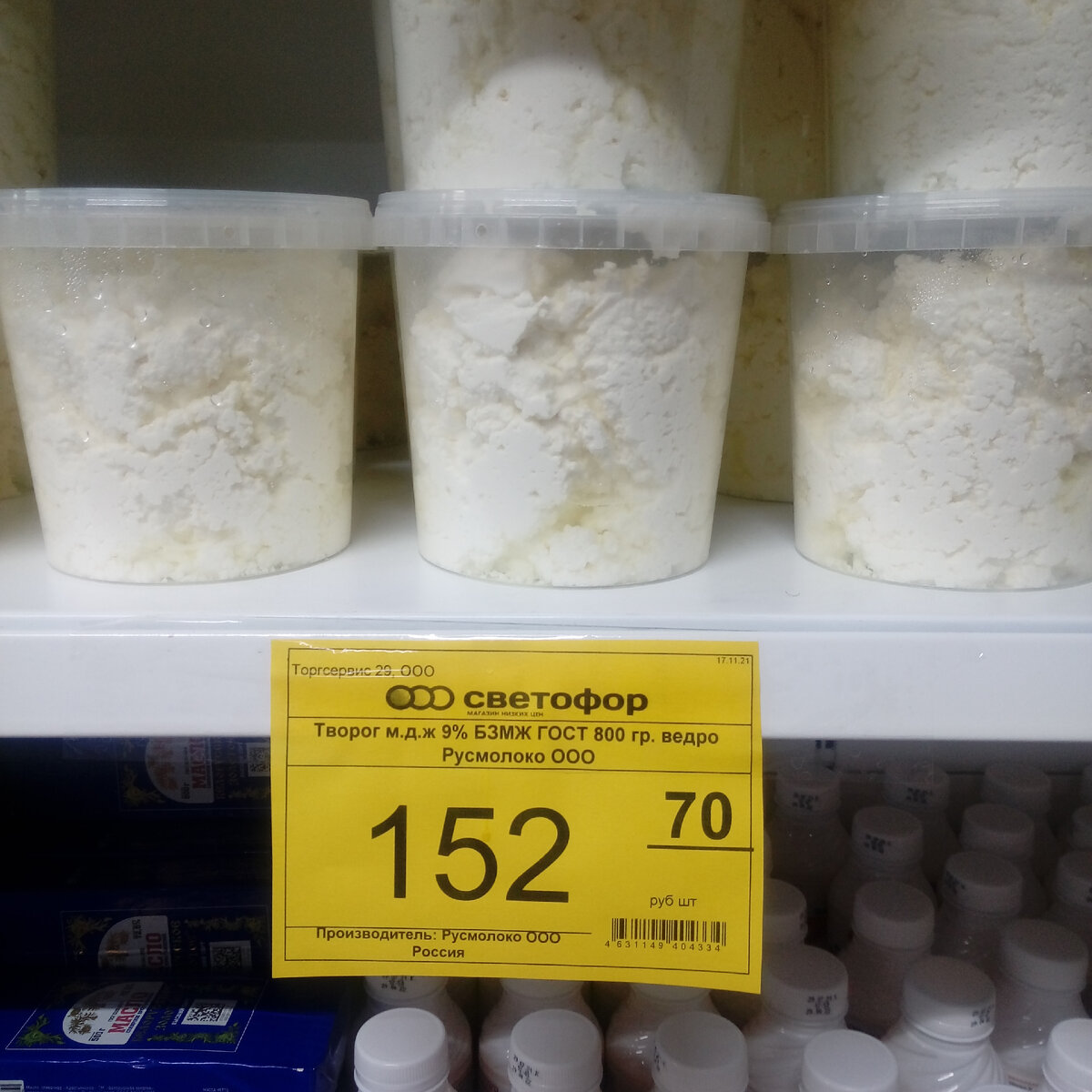 Мнение о купленном в "Светофоре" товаре - Творог м.д.ж. 9%, ООО Русмолоко, 800 гр за 152, 70 рублей. Этот творог вас не покорит.