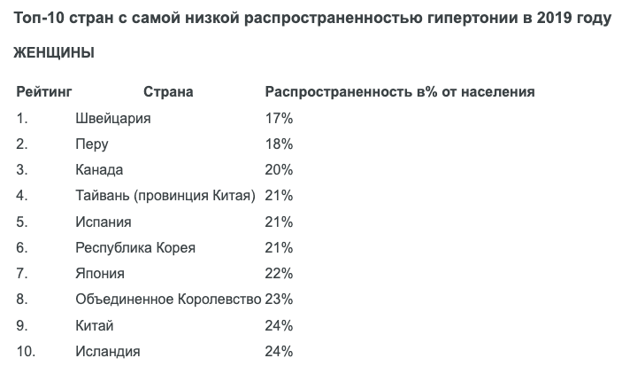 В Канаде, Перу и Швейцарии уровень распространенности гипертонии был одним из самых низких в мире в 2019 году.