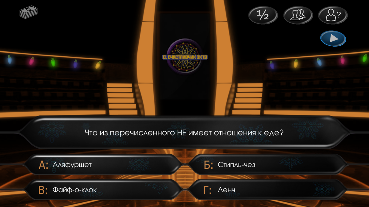 Так что же из перечисленного не имеет отношение к еде? Уже догадались, какой ответ является правильным? Даны варианты ответов: "Аляфуршет", "Стипль-чез", "Файф-о-клок", "Ленч". Правильный вариант ответа – Б(Стипль-чез). Стипль-чез не имеет отношения к еде. Здесь появляются скриншоты из игры для смартфонов "О счастливчик 2k19". Ссылка на скачивание игры: https://play.google.com/store/apps/details?id=com.onemillionairetrivia.m2K20. Друзья, это ссылка на последнюю версию игры. Игра "О счастливчик 2k19" недоступна в Google Play Market, зато она есть в App Store. На моем канале представлены скриншоты вопросов из игры "О счастливчик 2k19", а также развернутые ответы на эти вопросы. Сначала идет вопрос, затем - развернутый ответ на него. Добро пожаловать в интеллектуальный клуб. Друзья, буду рад, если вы присоединитесь к моему сообществу во "Вконтакте". Ссылку на сообщество можно будет увидеть в конце этой статьи. В моем сообществе во "Вконтакте" гораздо больше информации, чем здесь. Стипль-