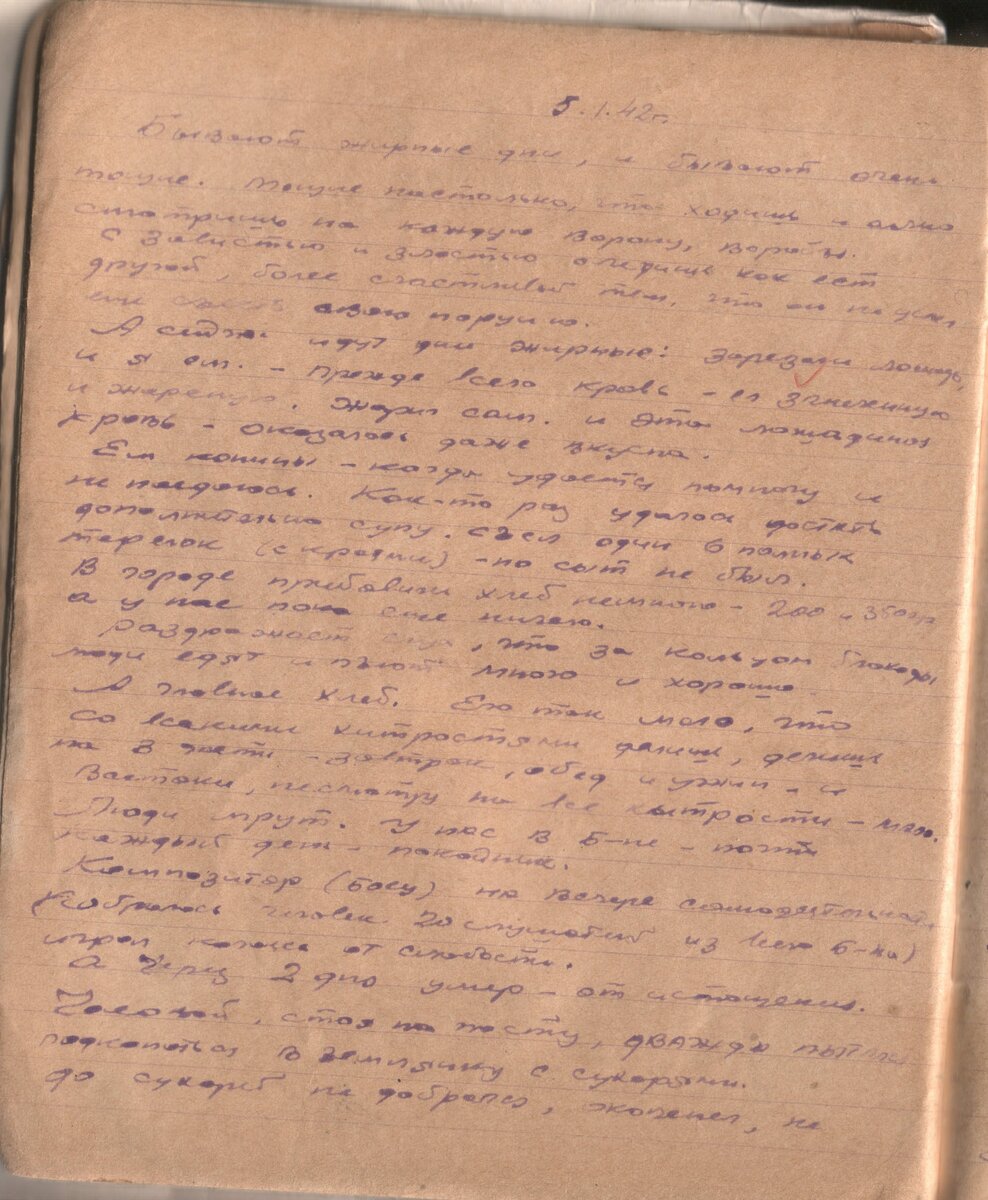 5.1.42г. Бывают жирные дни, и бывают очень тощие. Тощие настолько, что ходишь и алчно смотришь на каждую ворону, воробья. С завистью и злостью следишь, как ест другой, более счастливый тем, что он не успел съесть свою порцию. А сейчас идут дни жирные: зарезали лошадь, и я ем. – прежде всего кровь – ел («сгнехинаю» - не разобрал – прим. св) и жареную. Жарил сам. И эта лошадиная кровь – оказалась даже вкусна. Ем конины – когда удается помногу и не наедаюсь. Как-то раз удалось достать дополнительно супу. Съел один шесть полных тарелок (с краями) – но сыт не был. В городе прибавили хлеб немного – 200 и 350 гр., а у нас пока еще ничего. Раздражает слух, что за кольцом люди едят и пьют много и хорошо. А главное хлеб. Его так мало, что со всякими хитростями делишь, делишь на 3 части – завтрак, обед и ужин, и все таки, несмотря на все хитрости – мало. Люди мрут. У нас в б-не (батальоне – прим. св) – почти каждый день – покойник. Композитор (боец) на вечере самодеятельности (собралось человек 2