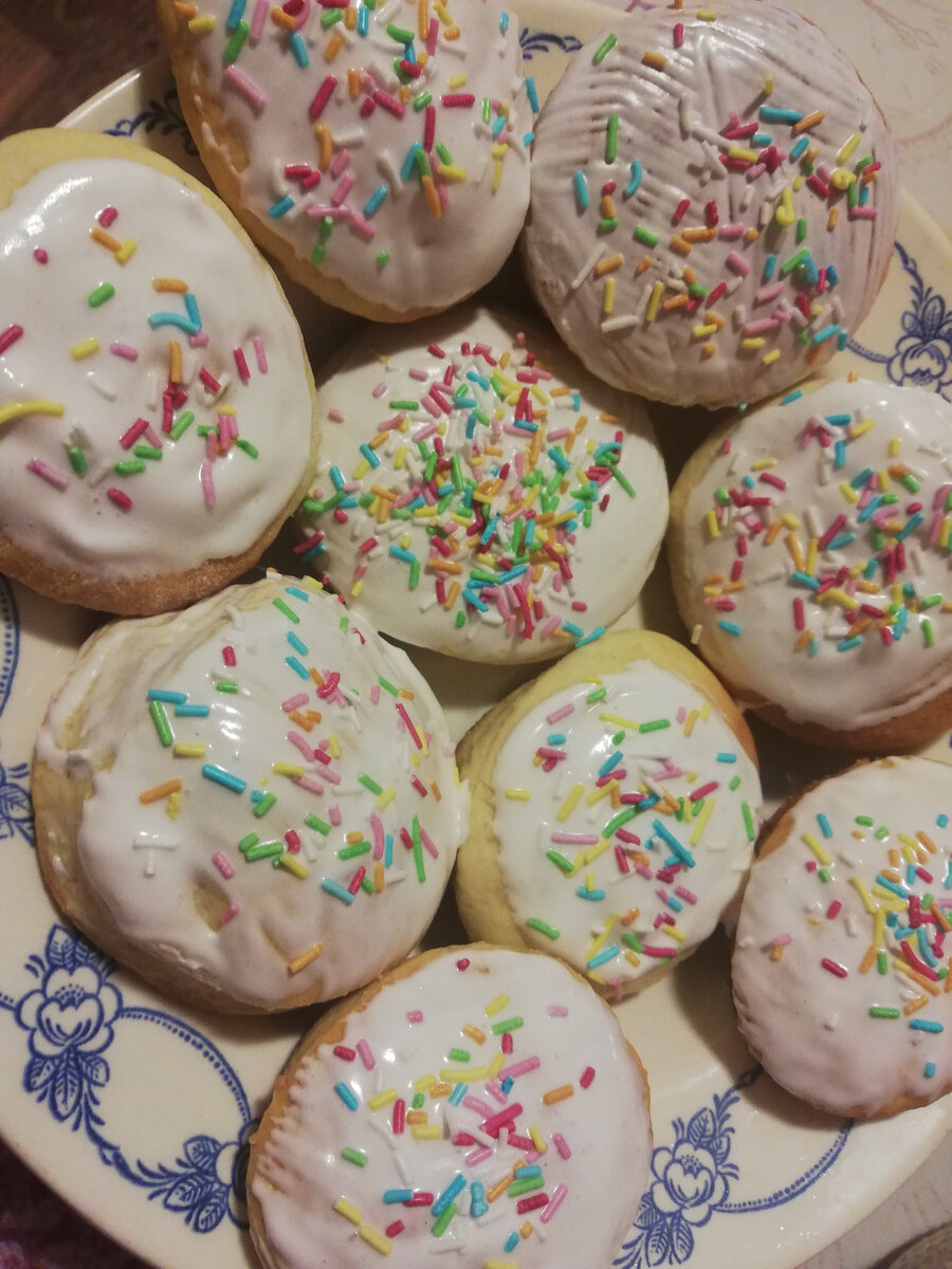Сегодня попробовала приготовить печенья по новому рецепту. Готовятся быстро, просто, получается вкусно :) Ингредиенты: Манная крупа — 1 ст Кислое молоко (кефир) — 1 ст Сахар — 1 ст Мука — 3 ст, но у меня ушло больше, зависит от муки. Яйца — 4 шт Маргарин — 200 г Соль - щепотка Сода - 0,5 чл Приготовление: Смешиваем кефир и манную крупу, оставляем на час. Растираем сахар с двумя яйцами и двумя желтками (белки оставим на глазурь). Добавляем в манную смесь перетертые яйца с сахаром. Добавить размягченный маргарин, соль, соду, просеянную муку. Замесить тесто, раскатать его, вырезать формочками фигурки. Выкладываем на противень не близко друг к другу (тесто немного увеличится в размере). Выпекать 20-30 минут при температуре 160-170 градусов. Готовность проверяем по цвету. Когда печенья станут золотистыми, они готовы. Долго не держать, чтобы не стали твёрдыми! Взбить два белка с 1чл лимонного сока и сахарной пудрой. Украсить печеньки по своему усмотрению :) Приятного аппетита :)