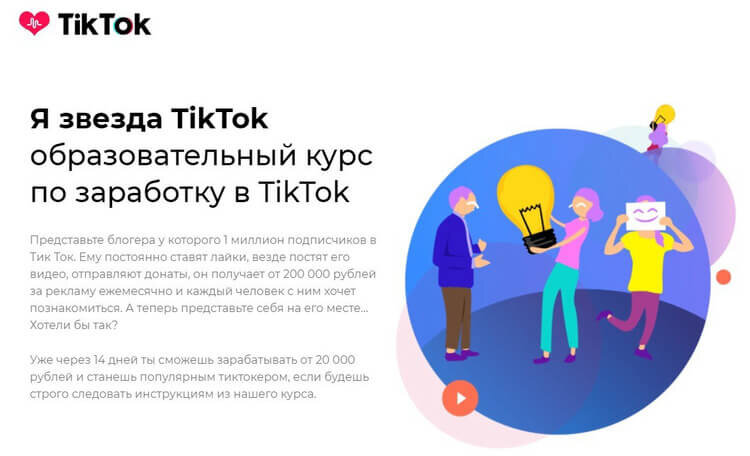 Небольшой курс от популярного проекта tiktokk.ru. Рассчитан на полностью самостоятельное изучение. Формат: Онлайн, все материалы приходят на почту: видео и текстовые файлы. Длительность: 2 недели. Цена: 200 рублей – со скидкой; 500 рублей – обычная цена. Обратная связь: Нет. Кому подойдет: Школьники и студенты, мамы в декрете, начинающие блогеры, все, кто хочет начать вести свою страницу в Tik Tok. Что изучают: Рассматриваются базовые моменты: создание страницы, выбор ниши, правила ведения аккаунта, тренды. Также есть гайд по монетизации аккаунта из 8 источников и бесплатному продвижению. Как проходят занятия: После оплаты на почту приходят все видео и текстовые материалы, можно смотреть и изучать в любое удобное время. Что в итоге: Ученик быстро осваивает основы ведения канала. Доступ к материалам остается навсегда. Записатьcя на курс