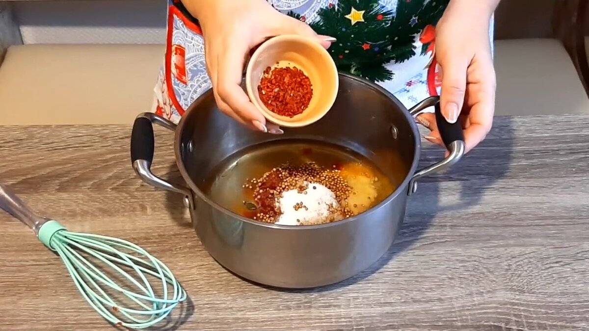 Всем огромный привет! Вы уже начинаете продумывать меню на праздники? Если нет, то этот рецепт всё равно вам пригодится 😊, ведь он подойдет не только для праздничного стола, но и для обычного семейного ужина или обеда. Ведь такую рыбку, маринованную в томатной заливке, можно подать даже с самой простой картошечкой в мундирах или просто на чёрный хлебушек. Мммм... Побалуйте своих близких такой скумбрией или внесите её в список праздничных закусок, что тоже потом облегчит продумывание праздничного меню. Итак, начинаем! Подробности вы можете посмотреть в этом коротком видео: Что же нам понадобится: Способ приготовления: Шаг 1: Первым делом приготовлю маринад для скумбрии или селедки. В кастрюлю я отправляю томатную пасту, растительное масло, уксус (количество уксуса я уменьшила, чем в оригинальном рецепты и указала для вас уже свое количество, но вы обязательно пробуйте и возможно для вас все 50 мл будут как раз), горчицу в зернах, соль, сахар, душистый перец, кориандр и перец чили (може