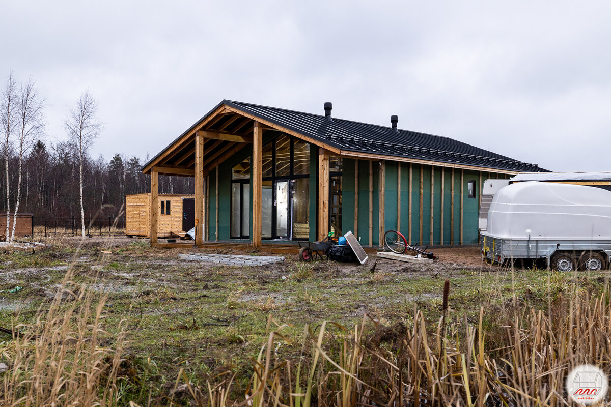 Ещё один наш объект, где в настоящее время идёт III этап стройки. Занимаемся фасадом, утепляем дом, только недавно начали, а вернее, продолжили работы. Домик здесь относительно небольшой, общие габариты 9*10 метров + терраса 2,5*9 м под общей с домом крышей: Ещё фото террасы: Давайте теперь посмотрим на дом с другой стороны, тут два больших окна в спальнях, размеры 200*225 и 280*225 см: На момент съёмки частично готова контробрешётка под деревянный вентфасад (будет фасадная доска от фирмы Краски Доски): Заглянем внутрь дома, где во всю идёт утепление стен: Утепляемся конечно же Кнауфом TS 035, это профессиональная линейка, я об этом писал немного подробнее в обзоре дома в Песках. Теперь проследуем в кухню-гостиную площадью 27 м2, там высокий потолок по стропилам. Ну как высокий, не очень – в самой верхней точке где-то 4,3 м, затяжки на высоте 3,34 м: Затяжки, если кто-то не знал, – это вот эти горизонтальные доски на потолке, которые стягивают нижнюю часть стропил: Элемент это констру