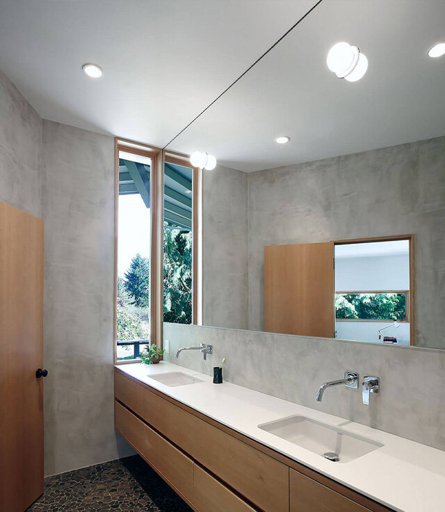 Обратите внимание на то, как зеркало выступает над парящим туалетным столиком, добавляя ощущение простора в комнату. Большое зеркало в этой ванной комнате действительно расширяет пространство и вносит в него современные ноты.