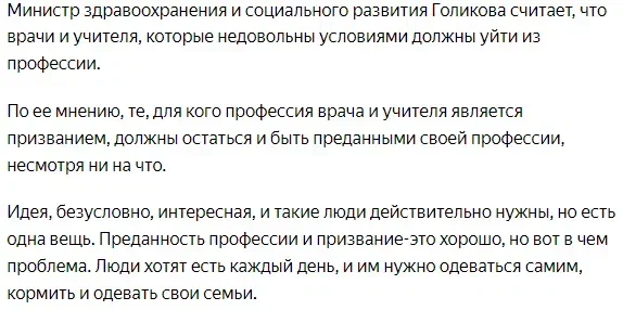 Голикова призывает уволиться всех недовольных учителей и врачей. "Вы шли сюда по призванию, а не за деньги" Зря она это сказала