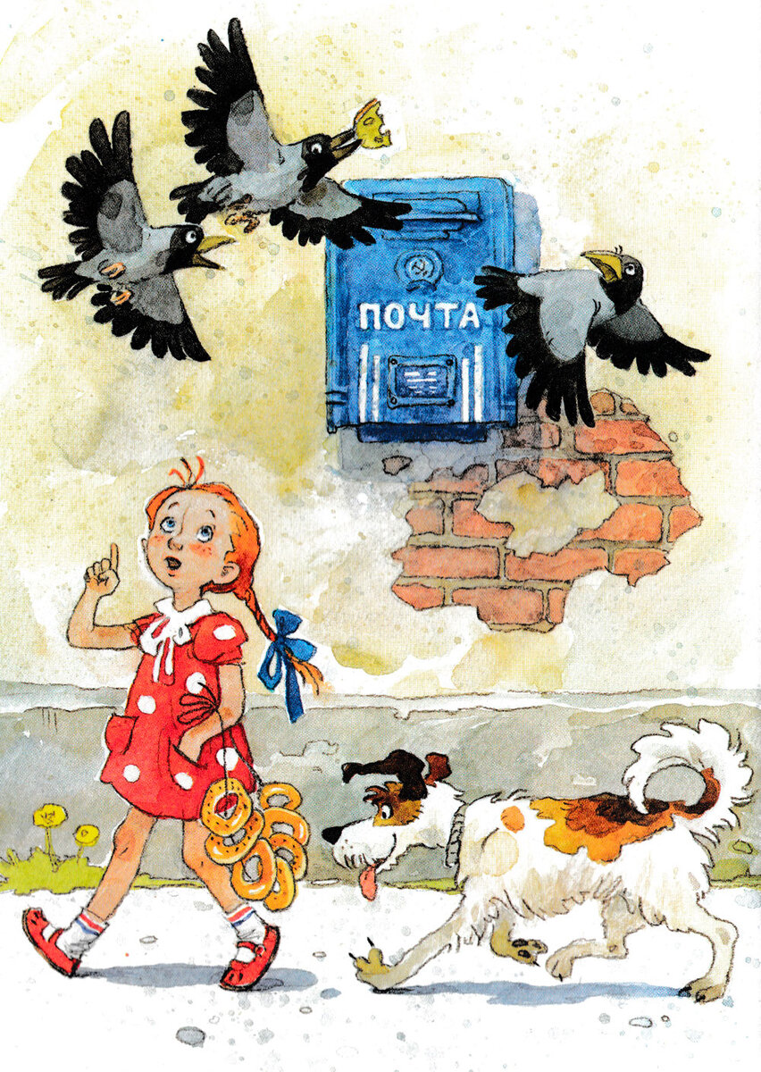 «Взяла Женя связку баранок и отправилась домой. Идет, по сторонам зевает, вывески читает, ворон считает. А сзади тем временем сзади пристала незнакомая собака, да все баранки одну за другой и съела. Сначала съела папины с тмином, потом мамины с маком, потом Женины с сахаром. Почувствовала Женя, что баранки стали что-то чересчур легкие. Обернулась, да уж поздно. Мочалка болтается пустая, а собака последнюю, розовую Павликову бараночку доедает, и счастливо облизывается.»