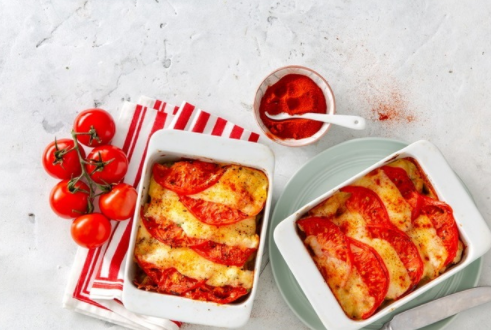 На овощи выложите, чередуя, сыр и помидоры, поперчите. Поставьте формочки в духовку, разогретую до 180С, и запекайте, пока сыр не р
