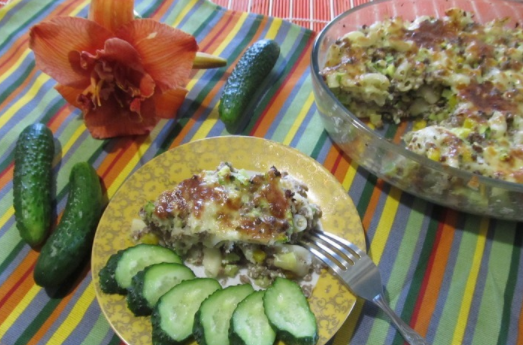 Как часто бывает, приготовишь какое-то блюдо экспромтом, и потом оно прочно прописывается в твоем меню. Так получилось и с этим блюдом. Оставалось немного лапши и фарша из куриных желудков. Добавила овощей, немножко сыра и залила яичной смесью. Получилось очень вкусно! Теперь такое блюдо делаю и летом из свежих овощей, и зимой из замороженных. Попробуйте!
