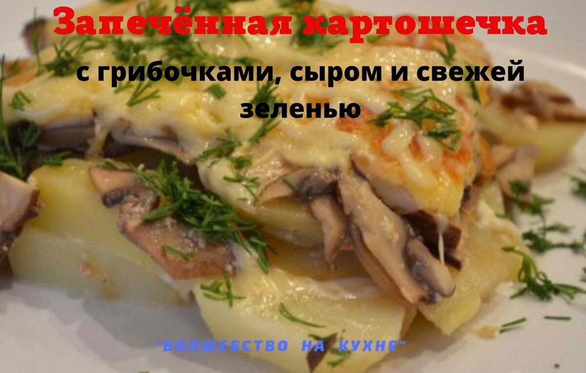 Запечённая картошечка с грибочками, сыром и свежей зеленью.