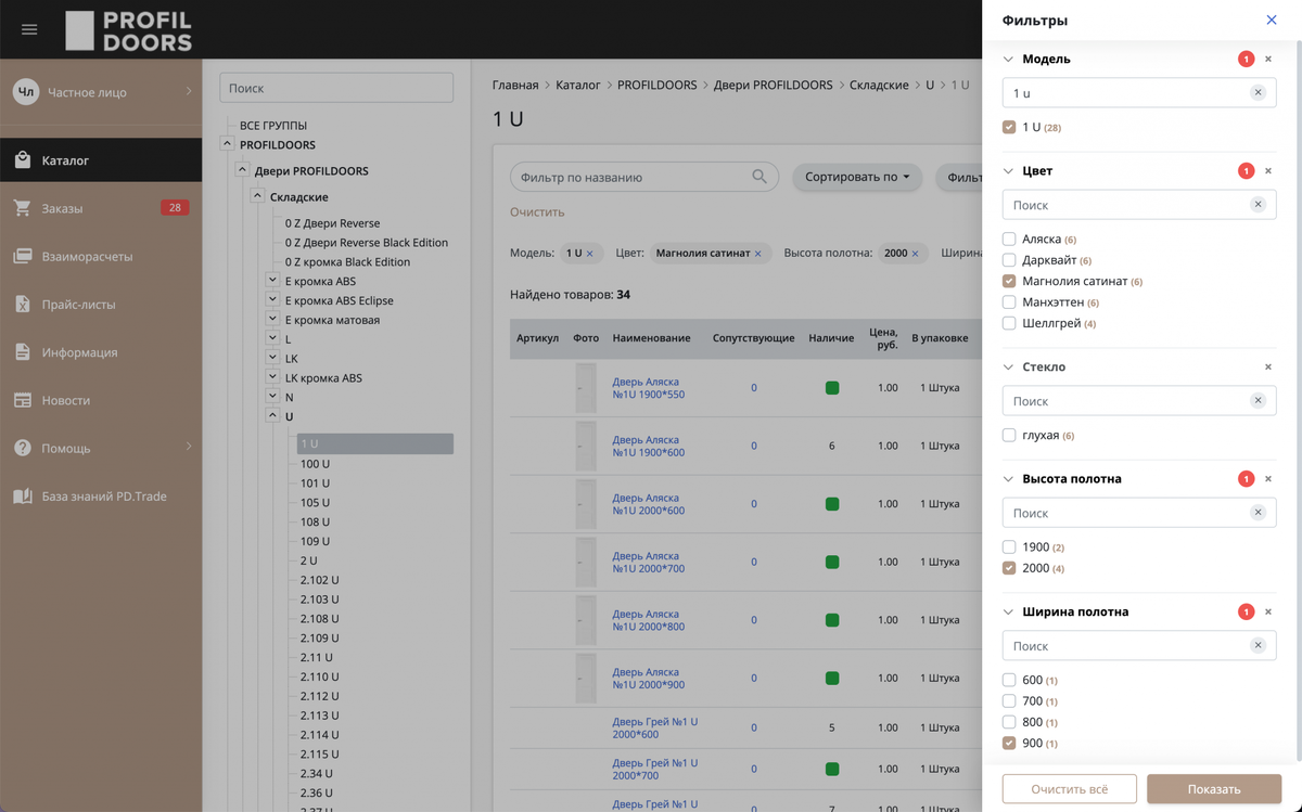 При заходе в каталог товаров пользователь видит кнопку “Фильтры”, по нажатию которой открывается панель формирования фильтра, которая основана на данных из 1С об этих товарах. На панели пользователь видит блоки возможных значений каждого из свойств. Пользователь имеет возможность: Рядом с каждым свойством динамически показывается количество значений, выбранных пользователем. Если количество значений у определенного свойства очень большое, то блок ограничивается по высоте с включенным скроллингом внутри списка возможных значений выбранного свойства для удобства пользователя. У пользователя есть возможность нажать кнопку “Очистить все”, для того чтобы снять все фильтры в текущей группе товаров, выбранной пользователем на панели в древовидном каталоге, который находится слева от списка товаров. По мере того как пользователь отмечает необходимые свойства для их фильтрации, интерфейс периодически делает запросы на сервер с целью расчета общего количества активных товаров, подходящих под выб
