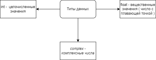 1) Численные типы данных: int, float, complex Например: a) i: int = 42 b) f: float = 42.50 с)3 + 7j print( i + 42) print(f + i) 100.0 + 0.001j 100. + .00j 2e-10 - 2e10j Кстати, символ мнимой единицы j не может существовать сам по себе, к нему обязательно должно быть присоединено какое-то число, т.е. мнимая единица в Python выглядит как 1j, а любое число у которого действительная часть равна 00 можно указывать без нее. 2) Списки - list, tuple, range Списки - тип данных, предназначенный для хранения набора или последовательности разных элементов. 3) Ну и строка, не знаю нужна объяснять что такое строка. Думаю все это знают. 4) Еще скажу пару слов о bool - булевый тип данных. Они бывают двух видов