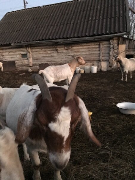 Буквально пару слов о красивых и правильных рогах у бурской породы коз. У козлов - рога должны идти назад, плавно огибая голову. Они должны быть достаточно сильно прижаты к голове и шее. Но в тоже время не касаться их и не доставлять неприятных ощущений козлу. Вот у Штопора, рога штопором, таких рогов быть не должно. Из всех шести козлов, которые «практиковались» в нашем стаде, у двух козлов были рога достаточно близкие к идеальным. У остальных имелся дефект от незначительного - рога образуют дугу, а дальше сильно расходятся, слабо примыкая к голове и шее, до существенного - закручивались штопором и примыкали к шее, натирали ее, чем доставляли существенное беспокойство для козла. У Малыша Грэя рога практически идеальные, но они очень далеко расположены от головы - 5-7 сантиметров - это многовато. У коз идеальными рогами бурской козы обладает Лапа - они плавно огибают голову, не уходят в стороны, а образуют не очень широкую латинскую букву V. Конечно, без нижней части. В стаде у F1 рог