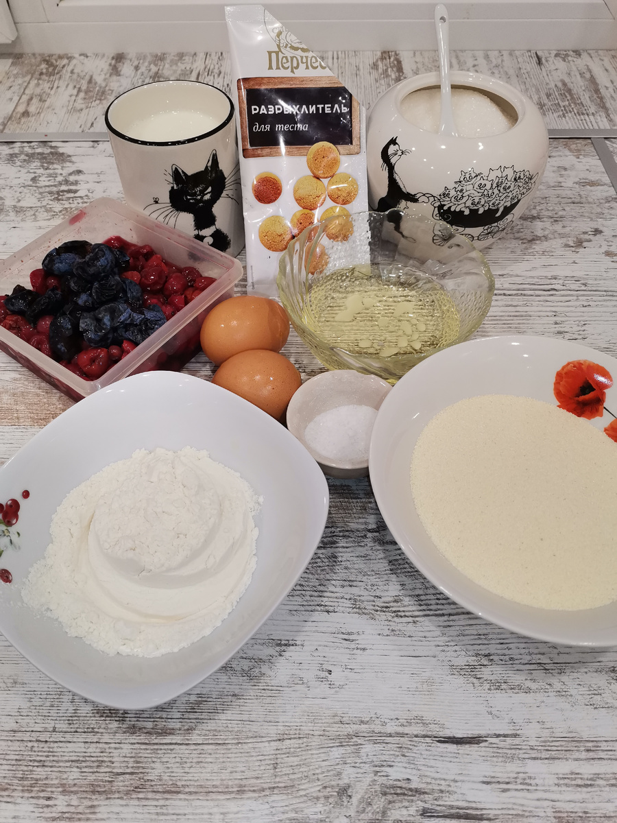 #Манник с ягодами. Отмеряем стаканом 250 мл. Ингредиенты: 2 яйца; 100 мл - растительное масло; 250 мл - кефира; 1 стакан сахара (200 мл); 1 стакан манная крупа (200 мл); 1 стакан муки (200 мл); 1 чайная ложка соды (гасить уксусом); щепотка соли; ягоды. Приготовление. Яйца и сахар взбиваем. Добавляем подсолнечное масло и кефир, перемешиваем. Далее манку и муку, щепотку соли, соду. Вновь тщательно перемешиваем. Ягода, если замороженная как у меня мои лесные ягодки, то отжимаем, чтобы избавиться от лишней влаги. Половину теста выливаем в формочку смазанную подсолнечным маслом (у меня диаметр 26 см, если меньше, то будет пышнее). Выкладываем ягоды и сверху заливаем оставшимся тестом.