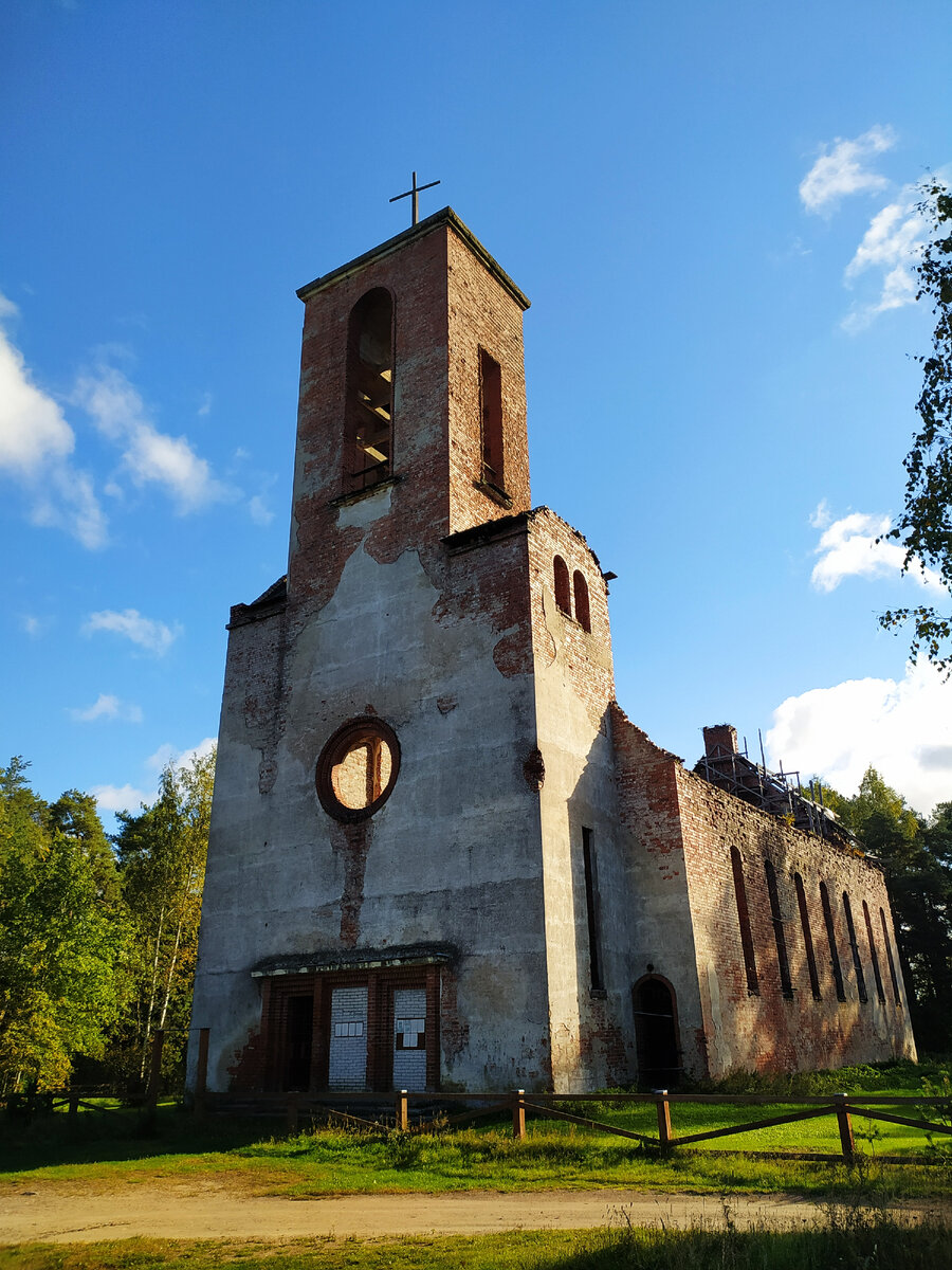 Чуть напротив, на другом берегу озера - кирха. Ее шпиль виднеется со стороны дороги. Помню, как летом, случайно оказалась у знакомых в Каннельрви и мы пешком решили пройти в поселок Победа. Тогда мы были в компании и мое предложение сходить к шпилю и посмотреть, что там такое, никто не поддержал. Но вот сейчас-то я и решилась проехать туда.