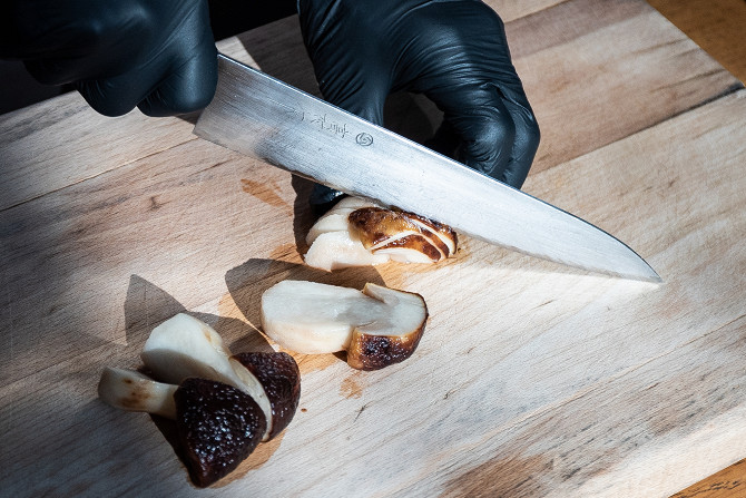 При нарезке следите за тем, чтобы гриб сохранил свою натуральную форму, никаких кубиков и соломок. Нарежьте грибы слайсами.