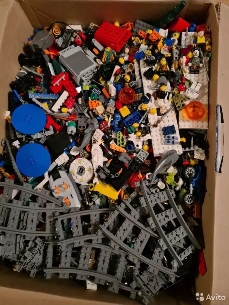 Вот лот, который приглянулся мне. Цена была вполне адекватная: 4250р за 10кг деталей. Минифигурки оригинальные, как и рельсы, но отдельные явно неоригинальные детали на крупных планах все-таки видно.