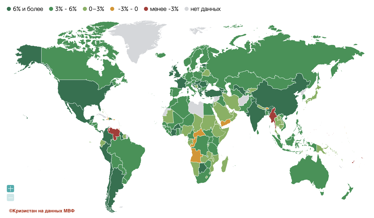 — Какая разница, на 4,3 или на 4,7% вырос за год ВВП России? Мировая экономика, вон, загибается под гнетом кризиса нового типа… Наверное, если рост больше троечки — уже хорошо, — думал я, открывая сводки оценок МВФ по росту мирового ВВП. Но визуализация роста ВВП на карте заставила меня усомниться, что глобальный экономический кризис вообще существует: Во избежание разночтений: существует несколько видов ВВП. В контексте этой статьи смотрим на рост общего валового продукта, то есть общей стоимости в постоянных ценах конечных товаров и услуг, произведенных в стране за год. Судя по расцветке — чем зеленее, тем лучше — экономический кризис существует исключительно в телевизоре. Потому что абсолютное большинство стран мира даже сейчас растет быстрее, чем на 3% в год. Что б они не делали, не идут дела… Самые плохие результаты у Мьянмы (-17,9%) и Венесуэлы (-5%). Если с Венесуэлой все понятно, то в бывшей Бирме единственная причина кризиса, которую я вижу — бесхозяйственность. Природа щедро