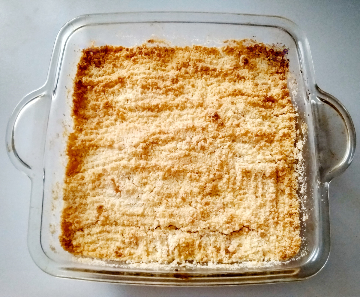 Вынимаю яблочный крамбл из духовки и подаю его на стол