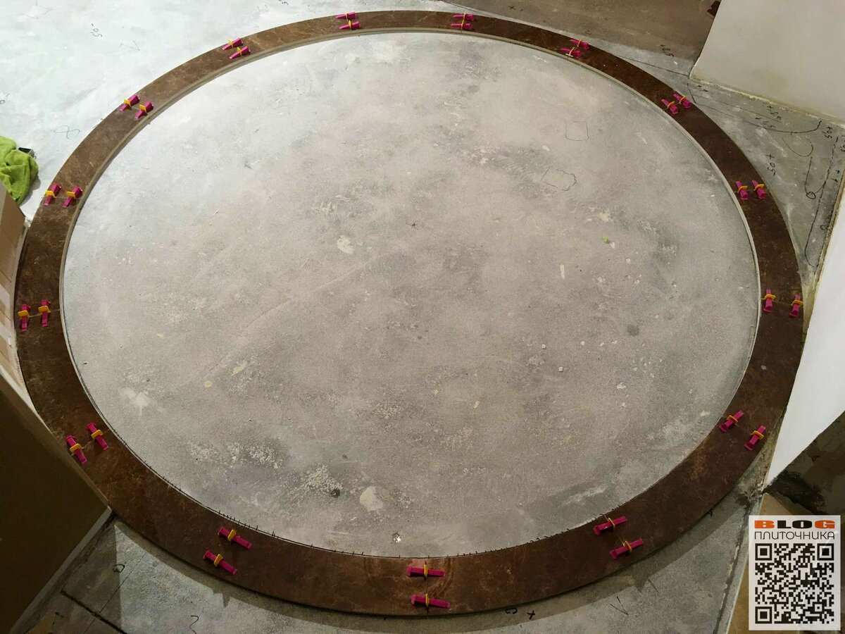 — Чем вы будете выравнивать? — Им же. — Что значит им же? Я у одного эксперта читала, что для этого есть специальные смеси. — Есть и специальные, всё верно. В то же время есть случаи, когда можно обойтись и без них. Тем более, когда речь идёт о небольшом объёме. — А где гарантия, что она не отвалится? *** Диалог этот случился на одном из объектов, где нужно было сделать около 4м² стяжки, под плитку. Толщина стяжки 1,5см. Справедливости ради скажу, что опасения заказчицы в данном случае были более чем оправданы. Собака, как обычно, зарыта в нюансах. Но обо всём по порядку. Я ведь обещал не только рассказать, но и показать 😉. Задача: нарастить и выровнять основание под мозаику В виде круга уложен бордюр из керамогранита. Внутри по итогу должно быть уложено мозаичное панно. А как известно, мозаика укладывается на минимальный слой. Поэтому наращиваем. С одной стороны, можно было выставить трёхмиллиметровые маяки и по ним уже стянуть. Но я двинулся по пути меньшего сопротивления, ведь борд