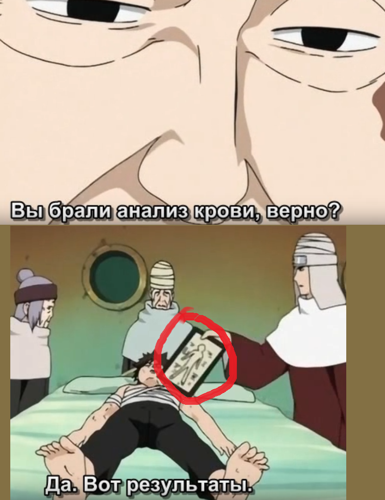 Чиё запрашивает анализ крови, после чего ей протягивают анамнез и мы на миг можем видеть листок, на котором нарисован... человечек!