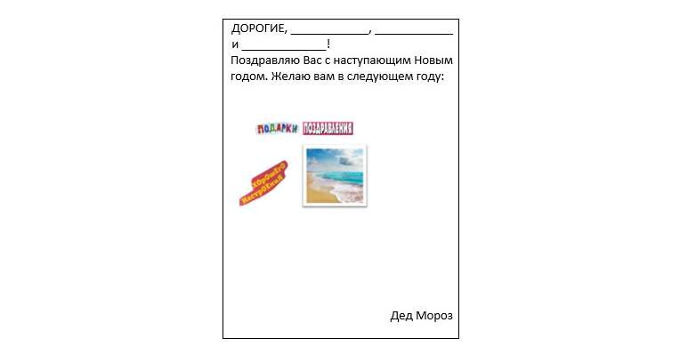 Или закажите адвент-календари всем членам семьи. И каждый день радуйте себя небольшими подарками, открывая окошки календаря. *** В начале декабря напишите Письма деду Морозу. Пусть пишет не только ребенок, но и мама с папой. *** Составьте все вместе меню к праздничному столу. Определитесь, как и когда будете покупать продукты. *** Выберите ответственного за новогодние конкурсы. Я нашей семье конкурсы провожу я обычно, но дочка тоже стала изъявлять желание провести один конкурс. *** 31 декабря не сидите весь дома, занимаясь уборкой и готовкой. Если сделать генеральную уборку не успели заранее, то ничего страшного. Лучше в этот день Новогодние конкурсы: Новогоднее "прикольное" поздравление - Составь поздравление-мечту на Новый год Вырезать из газет, журналов, старых к