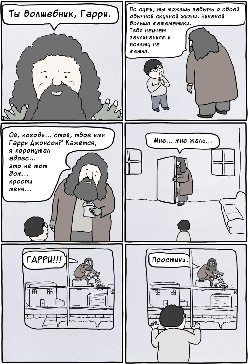В этом году исполнилось 20 лет фильму «Гарри Поттер и философский камень» - первой части серии фильмов, основанных на цикле романов английской писательницы Джоан Роулинг. Мировая премьера упомянутой картины состоялась 4 ноября 2001 года. И вот, прошло уже 20 лет, а начало истории мальчика-волшебника до сих пор является для многих одной из самых любимых кино-сказок. И по этому поводу я решил сделать тематическую подборку, посвященную как самому Гарри Поттеру, так и окружающим его персонажам. Надеюсь, что вам понравится! Один из самых запоминающихся моментов фильма «Гарри Поттер и философский камень», является сцена, в которой Хагрид сообщает маленькому Гарри очень важную новость о происхождении мальчика. Автор серии комиксов Elder Cactus («Старый кактус») решил немного переиначить эту сцену. Канадская художница по имени Сара Данлэйви (Sarah Dunlavey), также известная в сети под псевдонимом Madame Lady («Мадам Леди») очень часто посвящает свои комиксы персонажам, обитающим в Хогвартсе. О
