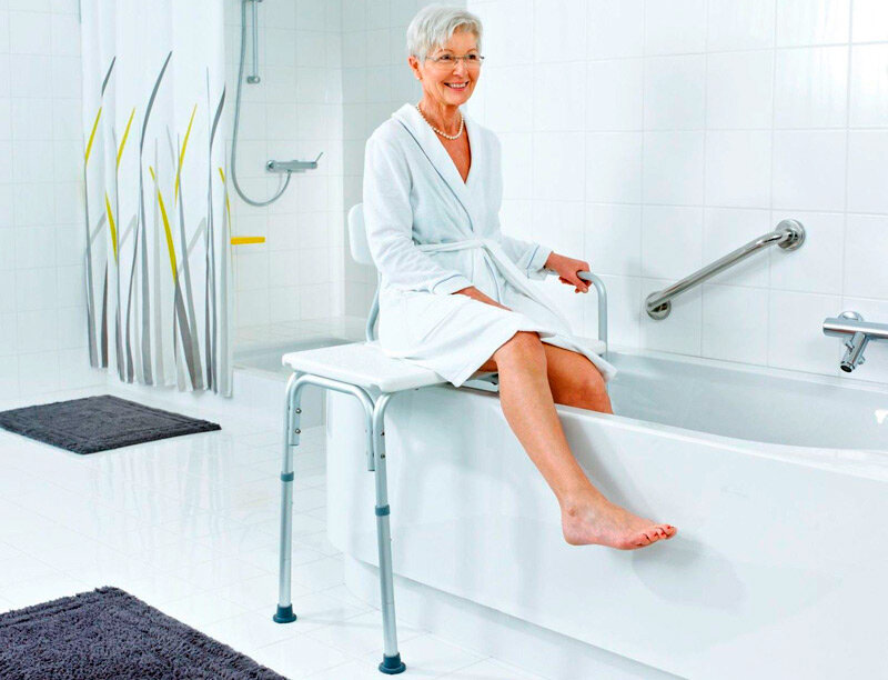 Регулируемые по высоте сиденья. Эти модели удобны для пенсионеров, которые имеют проблемы с мобильностью. С помощью удобной конструкции можно максимально низко опустить сиденье в ванную, чтобы престарелый человек попарился в теплой воде.