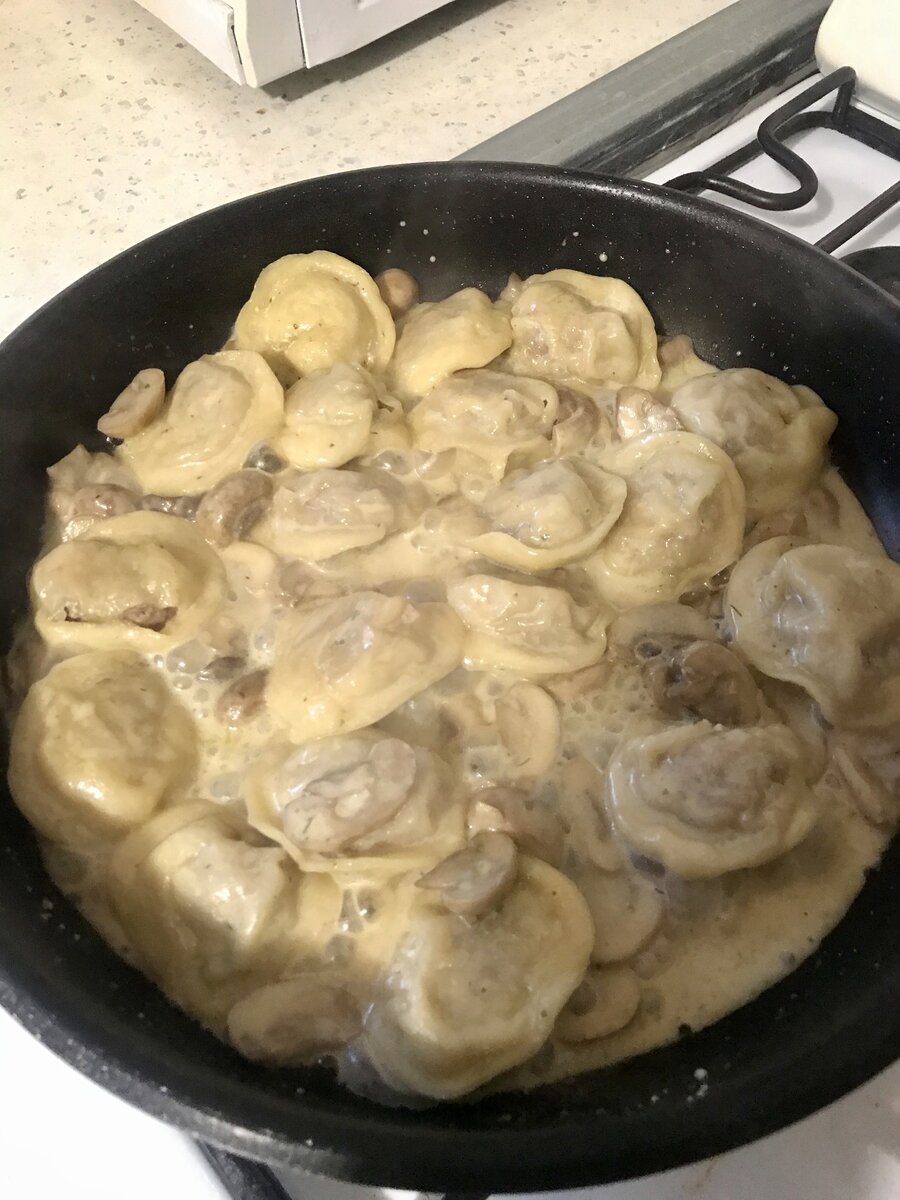 Раз уж вчера начали тему еды, то покажу один рецептик, который совсем недавно использовала сама первый раз! Думаю, что пельмешки любят все, особенно домашние, свеже налепленные! Так вот, хотела я их дома приготовить, но просто с бульоном или тупо жаренные – мне не хотелось. И в этом случае первый рецепт из Google спасает! Делюсь им: - пельмени; - шампиньоны; - сливочное масло; - сметана (но говорят, что лучше сливки); - соль, перец. Нарезать грибы мелко, обжарить немного на сливочном масле, после этого добавить немного воды и сметаны, туда же я добавила соль и специи, помешивала все время. Одновременно варила пельмешки до полуготовности и отправила их в сковороду к грибам, под крышку и тушить 5–7 минут, периодически переворачивая. Получилось очень вкусно и красиво, думаю на фото ниже это прекрасно видно, но если спросить, что бы я сделала по – другому, то однозначно скажу, что вместо сметаны добавила сливки, однозначно добавила мелко нарезанный лучок и обязательно украсила в самом кон