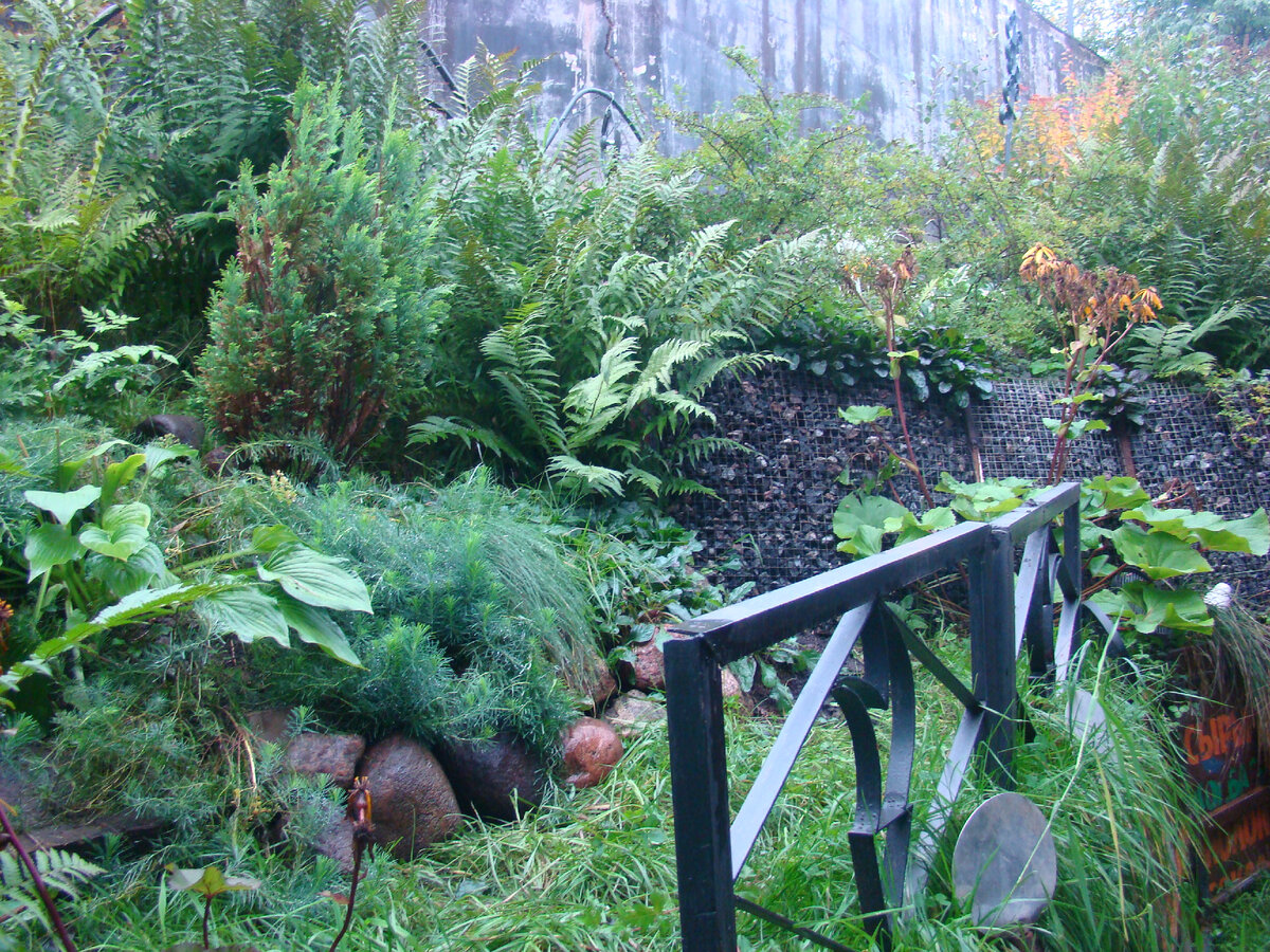 А это кусочек правее, перешеек между уголком за домом и собственно Садом хост. Папоротникам подкормка глиной похоже пошла на пользу. На лес похожи.