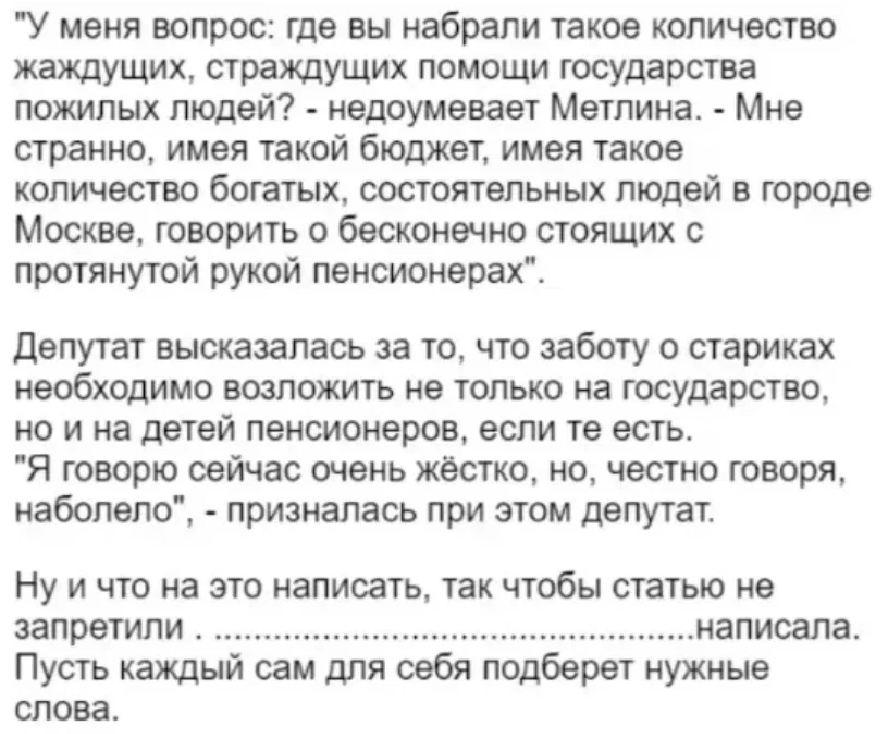"Будем требовать от пенсионеров, чтобы их дети содержали родителей!" Грубо выразилась депутат Мосгордумы. Ответ других ошеломил