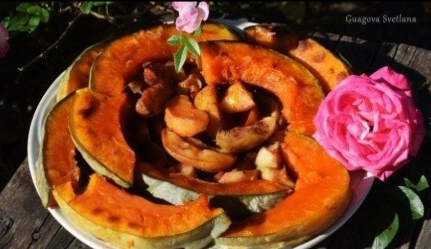 Предлагаю приготовить вкусный, ароматный и яркий десерт - кусочки тыквы с яблоками, запечённые в духовке